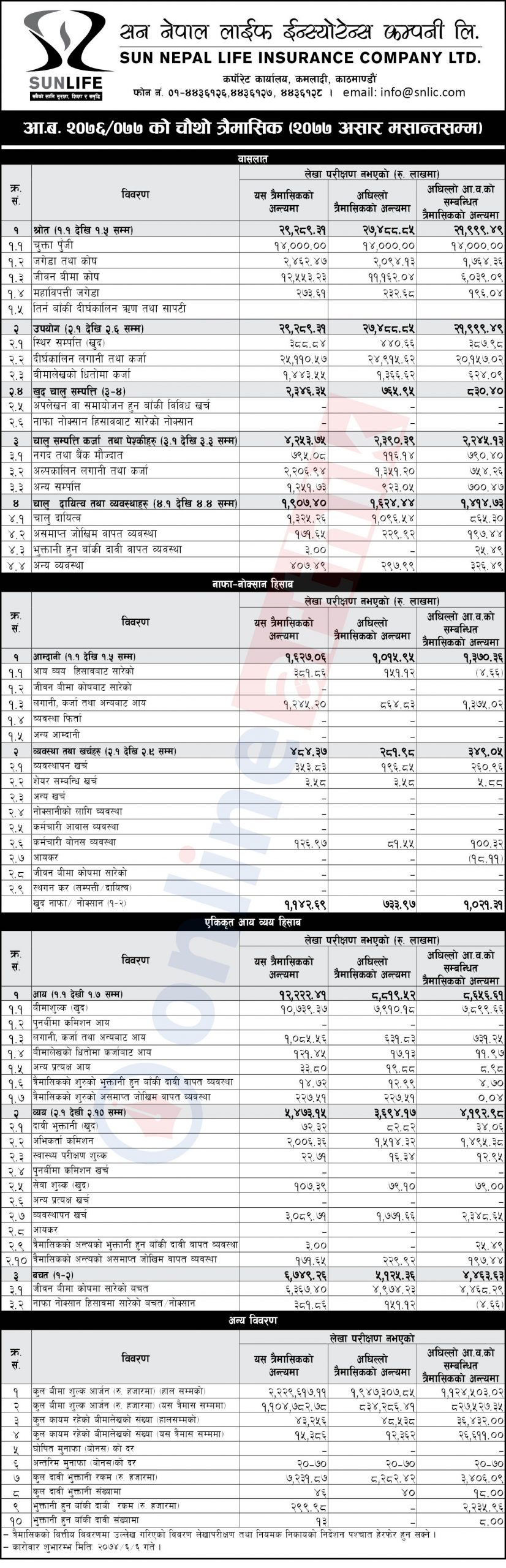 सन नेपाल लाइफ इन्स्योरेन्सले गत आर्थिक वर्षको चौंथो त्रैमाससम्ममा एक अर्ब ७ करोड ३९ लाख रुपैयाँ खुद बीमाशुल्क आर्जन गरेको छ । यो अघिल्लो आर्थिक वर्षको यहि अवधिको तुलनामा २८ करोड ४० लाख रुपैयाँले बढी हो ।अघिल्लो आर्थिक वर्षको चौंथो त्रैमाससम्ममा कम्पनीले ७८ करोड ९९ लाख रुपैयाँ खुद बीमाशुल्क आर्जन गरेको थियो। कम्पनीले लगानी, कर्जा तथा अन्यबाट १० करोड ८५ लाख र बीमालेख धितोबाट १ करोड २१ लाख रुपैयाँ आम्दानी गरेको छ ।