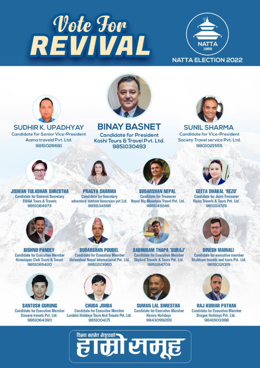 आगामी चैत्र १७ गते विहावार नेपाल एशोसियसन अफ टुर एण्ड ट्राभल एजेन्टस् (नाट्टा) को ५५ औ बार्षिक साधारणसभा र निर्वाचनले आगामी दुई वर्षका लागी नेतृत्व चयन गर्नेछ । नाट्टाको आगामी बिहीबार हुने कार्यसमिति निर्वाचनमा कोशी टुर्स एन्ड ट्राभल्सका सञ्चालक विनय बस्नेतको अध्यक्षतामा प्यानल घोषणासमेत भइसकेको छ ।