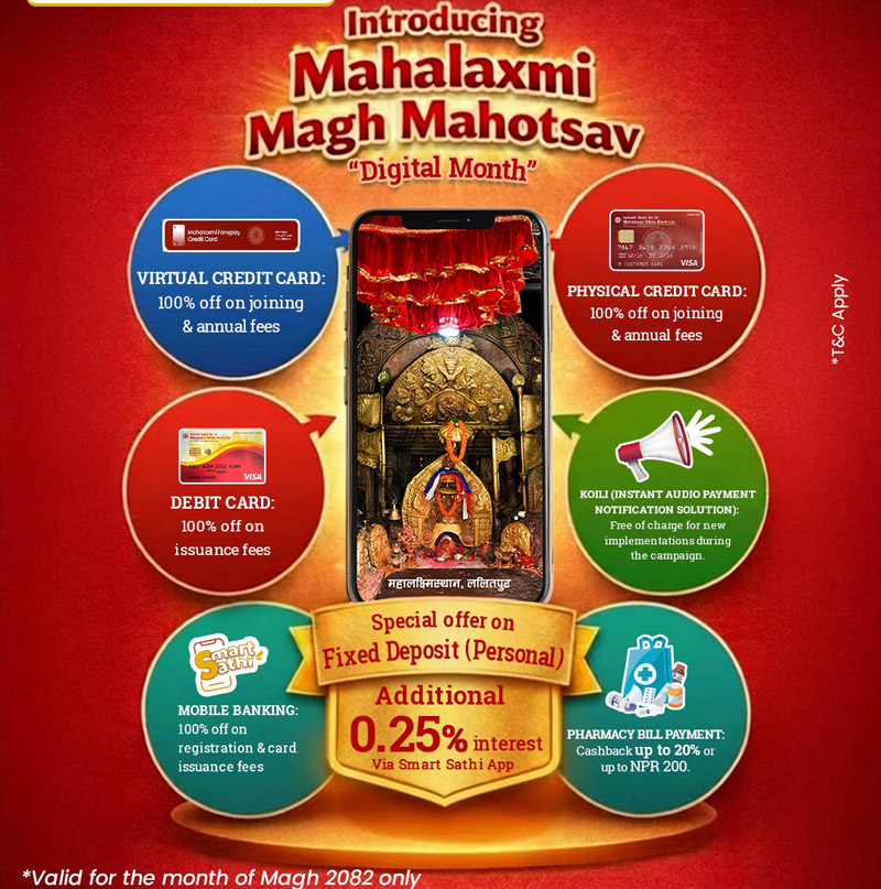 महालक्ष्मी विकास बैंक लिमिटेडले डिजिटल कारोबार प्रवर्द्धन तथा ग्राहक सुविधा अभिवृद्धिका उद्देश्यले ‘महालक्ष्मी माघ महोत्सव’ सञ्चालन गर्ने भएको छ।